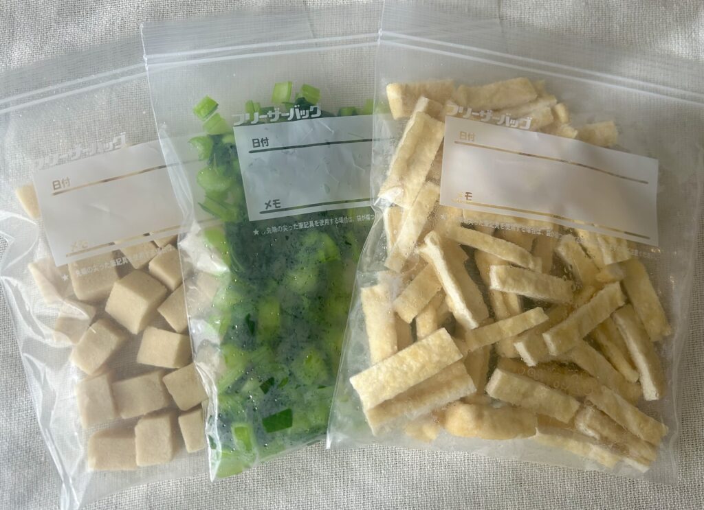時間をかけずに作れるよう、下準備した具材を冷凍保存しています。