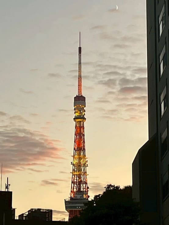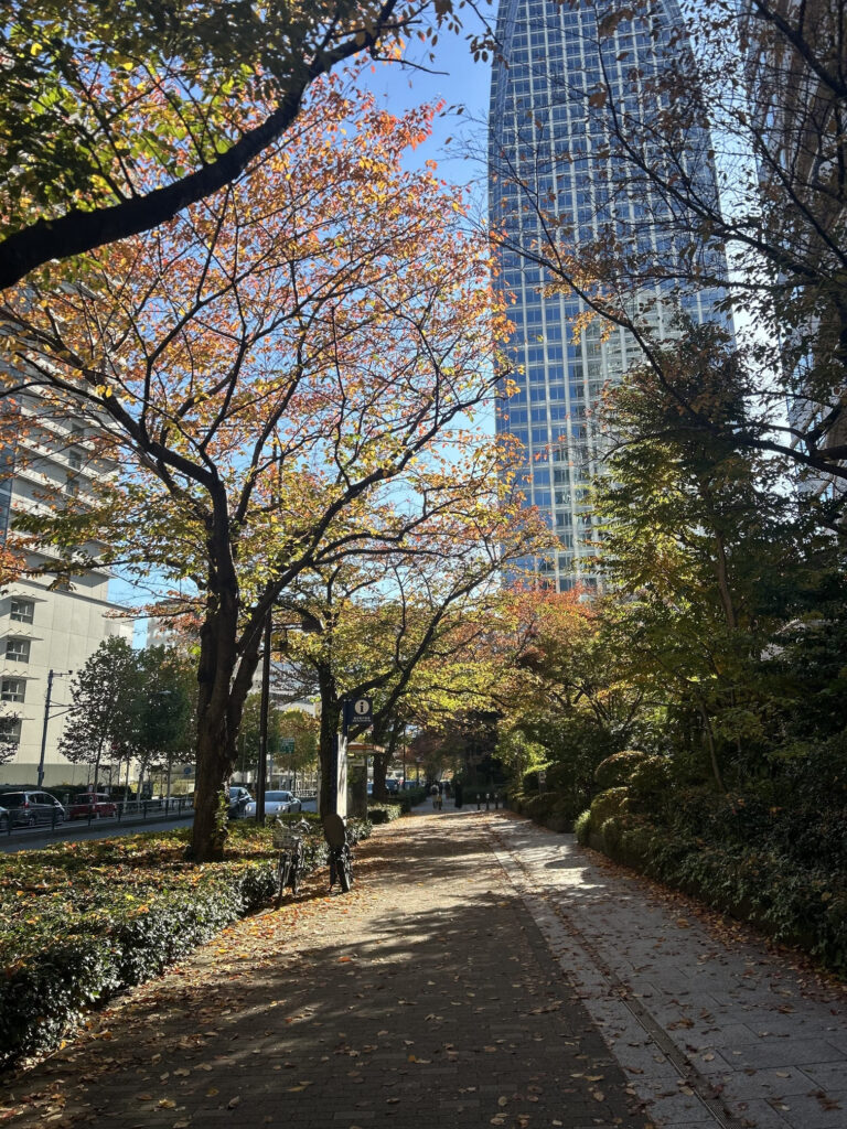 麻布台ヒルズに向かう道、季節を感じる歩道に、夕暮れ時の東京タワー。思わずシャッター写真を撮りたくなる景色が広がっていました。